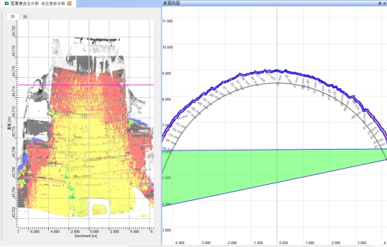 2D视图跟3D视图显示,基于扫描仪的全覆盖特性,可以查看任意位置的变化情况,图中左侧为对应的变化色差图,通过颜色来区分变化量的大小范围,右侧为对应查看里程上面的变形。